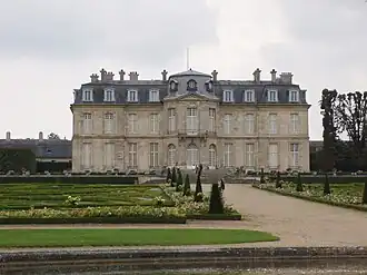 A planta maciça do palácio retoma exemplos do século XVII, como o Château de Blérancourt, por Salomon de Brosse (1612), ou o Château de Maisons, por François Mansart (1643). Situado no eixo do gradeamento de honra, o principal corps de logis está isolado ao fundo dum pátio, separado da estrada por um curto fosso trasporto por um salto-de-lobo. Simples gradeamentos ligam-no aos edifícios dos comuns.