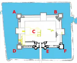 O castelo do século XV tem formato retangular, 75 por 53 metros, semelhante em projeto ao Castelo de Farleigh Hungerford [en] em Somerset ou ao Castelo de Baconsthorpe [en] em Norfolk.[37] Embora incompleto, os elementos sobreviventes e as fundações mostram que ele foi projetado com uma torre quadrada em cada canto, com torres laterais menos substanciais nas bordas nordeste, sudeste e sudoeste, e uma grande casa de guarda no lado noroeste.[38] Uma fileira interna de edifícios, com 5,2 metros de profundidade, corria ao longo do interior da muralha, recuada ligeiramente da própria parede e formando um pátio central.[39] As torres projetavam-se 1,8 metros para dentro do fosso cheio de água que cercava o castelo.[40]
