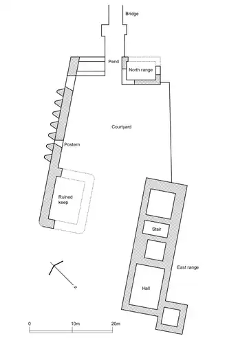 O castelo se encontra em uma encosta íngreme acima de uma curva do rio North Esk, protegendo-o em três lados. Esse promontório rochoso foi violado no lado norte para formar uma vala dando maior proteção. O acesso é dado a partir de ponte precipitada e através de uma guarita, atualmente em ruínas.[1]
