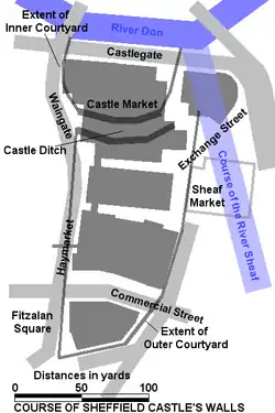 - ↑ «Sheffield Castle Archaeological Investigations». Sheffield City Council website. Sheffield City Council. Consultado em 1 de setembro de 2008