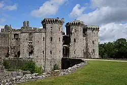 As casas-torre eram uma característica comum da construção de castelos britânicos e irlandeses no final do período medieval: mais de 3.000 foram construídas na Irlanda, cerca de 800 na Escócia e mais de 250 na Inglaterra.[208] Uma casa-torre seria tipicamente uma construção alta, quadrada, de pedra e ameada; as casas-torre escocesas e do Ulster eram frequentemente também cercadas por um barmkin [en] ou bawn, um pátio murado projetado para guardar animais valiosos com segurança, mas não necessariamente destinado a defesa séria.[209] Muitas das entradas nestes edifícios eram guardadas com yetts [en], portas semelhantes a grades feitas de barras de metal.[210] Versões menores de casas-torre no norte da Inglaterra e sul da Escócia eram conhecidas como torres peel, ou casas de pele, e foram construídas em ambos os lados das regiões fronteiriças.[211] Na Escócia, várias foram construídas em cidades escocesas.[212] Originalmente argumentou-se que as casas-torre irlandesas eram baseadas no design escocês, mas o padrão de desenvolvimento de tais castelos na Irlanda não suporta esta hipótese.[213]