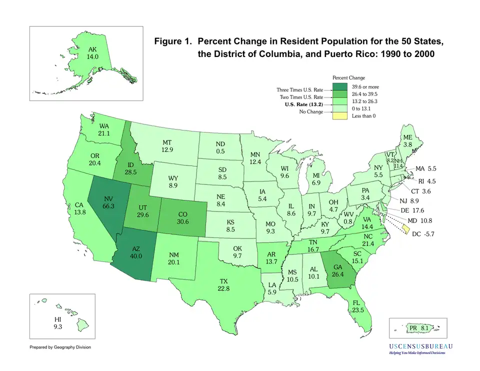 O estado mais povoado foi a Califórnia com 33 871 648 pessoas, e o menos povoado era o Wyoming com 493 782 habitantes. O estado que mais cresceu em número de residentes foi a Califórnia, com 4 111 627, e em taxa de aumento percentual foi o Nevada, com um incremento de 66,3% (769 424 habitantes) desde 1990.