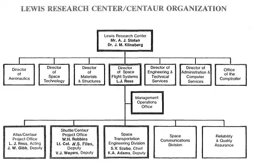 William H. Robbins [en] foi nomeado chefe do Escritório do Projeto Ônibus Espacial-Centaur no Centro de Pesquisa Lewis em julho de 1983. A maior parte de sua experiência era com o NERVA, e essa foi sua primeira experiência com o Centaur, mas ele era um gerente de projetos experiente, lidando com a administração e os arranjos financeiros do projeto.[70] Vernon Weyers foi seu vice. O major da USAF William Files também se tornou vice-gerente do projeto, trazendo seis oficiais da USAF que assumiram papéis-chave no Escritório do Projeto.[71] Marty Winkler liderou o programa Ônibus Espacial-Centaur na General Dynamics.[72] Steven V. Szabo, que trabalhava com o Centaur desde 1963, era chefe da Divisão de Engenharia de Transporte Espacial do Centro de Pesquisa Lewis, responsável pelo lado técnico da integração do Ônibus Espacial e do Centaur, incluindo sistemas de propulsão, pressurização, estrutural, elétrico, orientação, controle e telemetria. Edwin Muckley liderava o Escritório de Integração de Missão, responsável pelas cargas úteis. Frank Spurlock gerenciava o projeto de trajetórias de missão, e Joe Nieberding liderava o grupo Ônibus Espacial-Centaur dentro da Divisão de Engenharia de Transporte Espacial. Spurlock e Nieberding contrataram muitos engenheiros jovens, dando ao projeto Ônibus Espacial-Centaur uma mistura de juventude e experiência.[70]