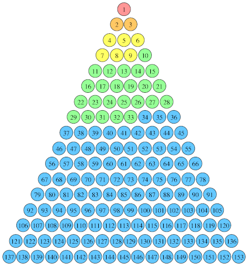 Como um número triangular, 153 é a soma dos primeiros 17 inteiros e também é a soma dos cinco primeiros fatoriais positivos: .[1] O número 153 também é um número hexagonal.[2]