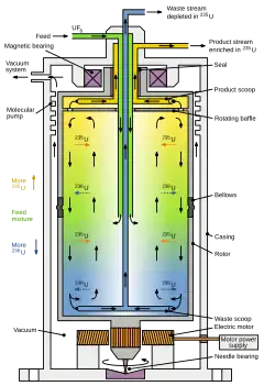 A separação do urânio requer o material na forma gasosa; o hexafluoreto de urânio (UF6) é usado para enriquecimento de urânio. Ao entrar no cilindro da centrífuga, o gás UF6 sofre rotação em alta velocidade, o que cria uma forte força centrífuga que atrai moléculas de gás mais pesadas (contendo U238) em direção à parede do cilindro, enquanto as moléculas de gás mais leves (contendo U235) tendem a se acumular mais perto do centro. O fluxo ligeiramente enriquecido em U235 é retirado e alimentado no próximo estágio superior, enquanto o fluxo ligeiramente esgotado é reciclado de volta para o próximo estágio inferior.