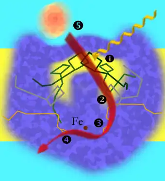 1: Excitação dos eléctrons; 2: Condução dos eléctrons para uma molécula de feofitina adjacente a outra bacterioclorofila; 3: Captura dos eléctrons por uma molécula de ubiquinona; 4: Repasse dos eléctrons a uma segunda molécula de ubiquinona; 5: Citocromos (alaranjado) preenchem a deficiência de eléctrons da clorofila positivamente carregada do par especial.[1]