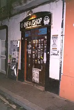Infoshops são espaços multifuncionais que disseminam mídia alternativa e fornecem um fórum para atividades culturais, econômicas, políticas e sociais alternativas.[19] Infoshops individuais variam em recursos, mas podem incluir uma pequena biblioteca ou sala de leitura e servir como um centro de distribuição para mídia alternativa gratuita e paga/varejo,[20] particularmente a mídia com a política anarquista revolucionária.[21] Enquanto as infoshops possam servir como uma espécie de biblioteca comunitária, elas são projetadas para atender às necessidades de informação de seus usuários, em vez de competir com a biblioteca pública ou centros de informação preexistentes.[22] Para editores alternativos e grupos de ativistas, as infoshops podem oferecer serviços reprográficos de baixo custo para publicações do tipo faça-você-mesmo, e fornecem um endereço de entrega postal para aqueles que não podem pagar uma caixa de correio ou receber correspondência em um endereço ocupado. Na década de 1990, as ferramentas disponíveis variavam de fotocopiadoras simples a software de editoração eletrônica. Além dessas funções de publicação impressa, as infoshops também podem hospedar reuniões, discussões, concertos ou exposições.[20] Por exemplo, à medida que o vídeo ativista cresceu na década de 1990, infoshops exibiam filmes e hospedavam grupos de discussão que, por sua vez, incentivavam o debate e a ação coletiva.[19] A infoshop tenta oferecer um espaço onde os indivíduos podem publicar sem as restrições da grande imprensa[8] e discutir ideias alternativas livres dehomofobia, racismo e sexismo.[23]