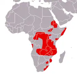 | Inclui intervalos de espécies intimamente relacionadas Cercopithecus mitis albogularis, macaco-prateado, e Cercopithecus mitis kandti) | |