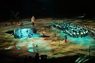 A montagem e concepção do ato de abertura foi responsabilidade do empresa Culture Fit. Franco Dragone, o criador do Cirque du Soleil e outros famosos fizeram montagens importantes de Artes Cênicas, em Las Vegas, foram os criadores da cerimônia. [2] Para as montagens foram mais de 100 especialistas do exterior [3].
