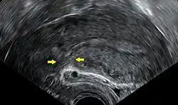Ultrassonografia transvaginal de um útero anos após uma cesariana, mostrando a formação de cicatriz característica em sua parte anterior