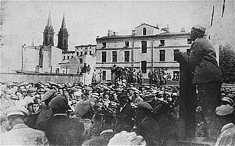 Por ordem dos alemães, Rumkowski fez um discurso em 4 de setembro de 1942, implorando aos judeus do gueto que entregassem crianças de até 10 anos de idade, bem como idosos com mais de 65 anos, para que outros pudessem sobreviver. "Ouviam-se lamentos horríveis e aterrorizantes entre a multidão reunida", diz a nota do transcritor em sua transcrição, frequentemente referida como: "Deem-me seus filhos".[25] Alguns comentaristas veem esse discurso como um exemplo de aspectos do Holocausto.[26]