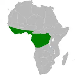 Pode ser encontrada nos seguintes países: Angola, Benin, Camarões, República Centro-Africana, República do Congo, República Democrática do Congo, Costa do Marfim, Guiné Equatorial, Gabão, Gana, Guiné, Guiné-Bissau, Libéria, Nigéria, Serra Leoa, Togo e Uganda.[1]
