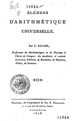 - ↑ a b c O'Connor, John J.; Robertson, Edmund F., «Christian Kramp», MacTutor History of Mathematics archive (em inglês), Universidade de St. Andrews