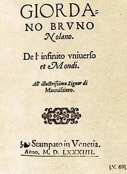 Quem rompe com essa ideia é Giordano Bruno, um dos primeiros a defender o modelo heliocêntrico de Copérnico, mas introduz a ideia de um universo infinito,no sentido de ser inumerável, imenso e infigurável. Ou seja, não haveria "centro" no Universo e teria infinitos mundos "dentro" desse Universo. Há mais claras evidências de que Giordano estaria ligado à questões míticas, tendo influências em ideias ficinianas. Ele também teve influência dos textos de Nicolau de Cusa para sua concepção de infinito. Giordano assim, dá um importante salto sobre como pensar o Universo, contudo, são pensamentos contrários à ideologia da Igreja, sendo assim, Giordano foi perseguido pela Inquisição e foi morto por ela.[9][10]