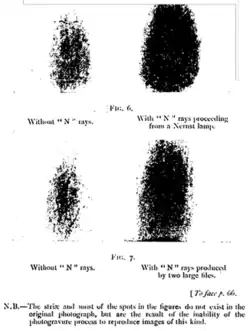 Em 1903, Prosper-René Blondlot estava trabalhando com raios X (como era o caso de muitos físicos da época) quando afirmou ter descoberto um novo tipo de radiação visível capaz de penetrar o alumínio, que batizou de raios N. Ele elaborou experimentos em que um objeto em quase total escuridão era iluminado por esses raios N, e que assim tornava-se "mais visível". Blondlot alegou que raios N estavam causando uma pequena reação visual, muito sutil para ser vista sob condições normais de iluminação, mas ligeiramente perceptível quando fontes normais de luz eram removidas.