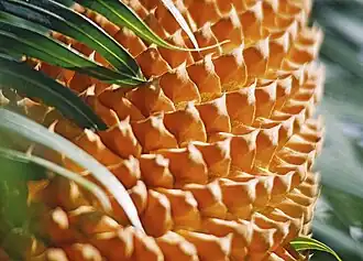 As Cycas são plantas dióicas, ou seja, cada indivíduo só tem órgãos masculinos ou femininos. Os cones masculinos terminam normalmente em um espinho. Cada microsporófilo possui numerosos microsporângios – os sacos polínicos – na sua página abaxial (inferior), que abrem por fendas para libertar os grãos de pólen, que são cimbiformes e monosulcados.