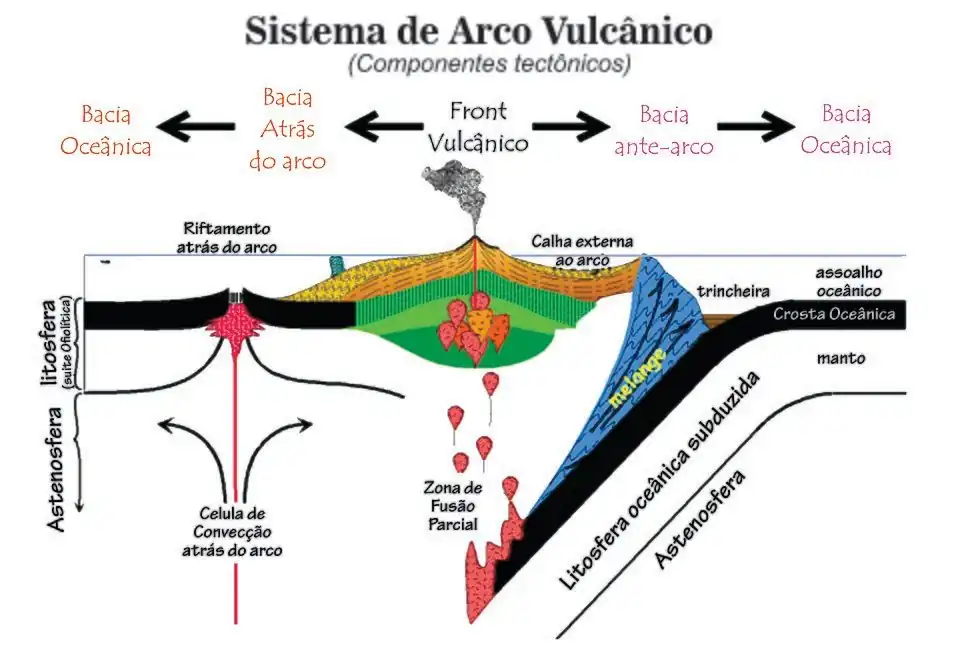 A crosta oceânica subduzida começa a sua descida fria, mas aquece-se enquanto desliza para dentro do manto. A cerca de 120 km, a rocha profunda começa a derreter para formar o magma. O magma, quente e de baixa densidade, sobe em direção à superfície, formando batólitos, e invade o solo oceânico como lava, construindo um vulcão que eventualmente sobe alto o suficiente para formar uma ilha. As ilhas japonesas são formadas a partir desse processo. A localização do vulcão é chamada de frente vulcânica. A área no lado da trincheira da frente vulcânica é bacia ante-arco, e a área no lado de trás da frente vulcânica é a bacia atrás do arco. Um novo limite convergente foi criado ao longo da zona de subducção [14]