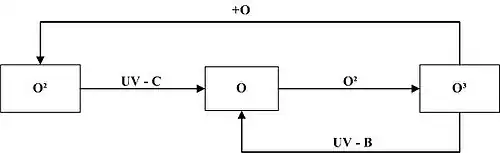 Da mesma maneira acontece a destruição do ozônio, qual absorve radiação UV-B e libera novamente moléculas diatômicas e atômicas. Funcionando como um ciclo, chamado de ciclo de Chapman.[2]