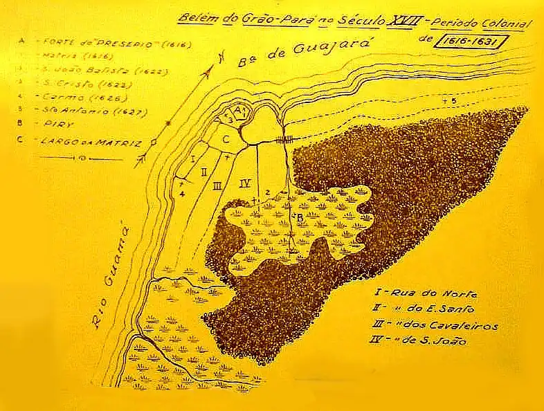 Inicialmente o povoado de Feliz Lusitânia era uma ilha, pois era cercado pelo igarapé do Piry e seus afluentes (em 🌍, aterrado em 1803).[12]