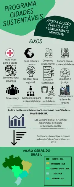 Lançado em 23 de março de 2021, o Índice de Desenvolvimento Sustentável das Cidades analisou o cumprimento das 770 cidades brasileiras signatárias do Programa Cidades Sustentáveis com relação aos Objetivos de Desenvolvimento Sustentável (ODS). Os resultados do indicador refletiram as desigualdades regionais brasileiras. As 100 cidades de melhor desempenho são municípios do Sudeste e Sul do Brasil, das quais 80 são paulistas, inclusive a primeira colocada, Morungaba. Já entre as 100 com pior desempenho, 86 estão situadas nas regiões Norte e Nordeste do país, incluindo a última colocada, Moju (Pará). O indicador foi elaborado pelo Programa Cidades Sustentáveis (ligado ao Instituto Cidades Sustentáveis), pela Rede de Soluções de Desenvolvimento Sustentável (ligado à Organização das Nações Unidas), pelo Centro Brasileiro de Análise e Planejamento (Cebrap) e pelo Projeto CITinova[20]