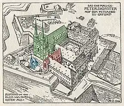 A Peterskirche, igreja do mosteiro, uma construção com 75 metros de comprimento, foi construída entre 1103 e 1147. Ele originalmente tinha duas torres na sua extremidade leste, que, juntamente com as torres da catedral de Erfurt e a Severikirche, dominavam o horizonte da cidade. Até o final do século XIII, os Imperadores do Sacro Império Romano-Germânico, muitas vezes realizavam tribunais na igreja. Também ocorreram sínodos ali.[27] Em novembro de 1181 uma Dieta Imperial foi realizada na igreja, presidida pelo Sacro Imperador Romano-Germânico Frederico I, conhecido como Barbarossa. Ali, o primo de Barbarossa, Henrique, o Leão submeteu-se à autoridade do imperador depois de vários anos de oposição e cedeu a maior parte de suas terras.[3][25]
