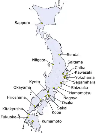 | Nome | Japonês | População (2010) | Data da designação | Região | Prefeitura | No. de wards | Divisões |