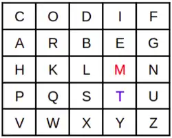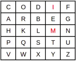 Agora que já temos a mensagem e a senha, precisamos preencher a matriz de com as letras do alfabeto. Para cifrar e decifrar os textos, a cifra Playfair usa uma matriz 5×5 preenchida com as 26 letras do alfabeto latino. Para isso, no modo clássico da cifra, a letra I passa a valer tanto como I quanto como J, o que dependerá da interpretação de quem decodificar a mensagem.