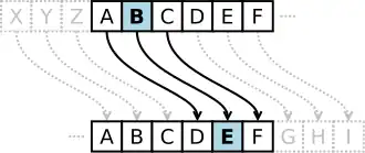 A transformação pode ser representada alinhando-se dois alfabetos; o alfabeto cifrado é o alfabeto normal rotacionado à direita ou esquerda por um número de posições. Por exemplo, aqui está uma cifra de César usando uma rotação à direita de três posições (o parâmetro de troca, três neste caso, é usado como chave).[1]