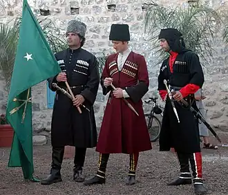 Circassianos israelenses em trajes cerimoniais tradicionais com a bandeira nacional circassiana, em 2010. | |