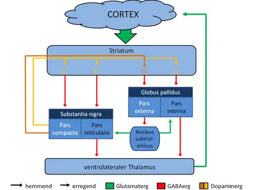 Existem cinco circuitos frontoestriatais definidos: os circuitos motor e oculomotor originados nos campos oculares frontais estão envolvidos nas funções motoras; enquanto os circuitos dorsolateral pré-frontal, frontal orbital e cingulado anterior estão envolvidos em funções executivas, comportamento social e estados motivacionais.[2] Esses cinco circuitos compartilham as mesmas estruturas anatômicas. Esses circuitos se originam no córtex pré-frontal e se projetam para o corpo estriado, seguido pelo globo pálido e pela substância negra e finalmente até o tálamo.[2] Há também ciclos de retroalimentação do tálamo de volta ao córtex pré-frontal completando os circuitos de circuito fechado. Além disso, existem conexões abertas para esses circuitos integrando informações de outras áreas do cérebro.[2]
