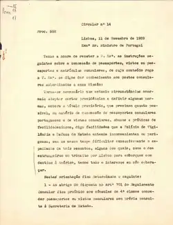 A Circular n.º 14, de 11 de novembro de 1939, do Ministério dos Negócios Estrangeiros português, dirigida aos representantes de Portugal no estrangeiro e subscrita pelo secretário-geral do ministério, Luís Teixeira de Sampaio, estabeleceu regras restritivas de concessão de vistos e de passaportes:[1]