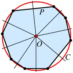 Um polígono que tem uma circunferência circunscrita se chama polígono cíclico.[4] Todos os polígonos simples regulares, todos os triângulos e todos os retângulos são cíclicos. Em todo polígono cíclico o circuncentro se localiza no ponto de interseção das mediatrizes dos lados do polígono.