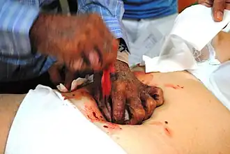 A "operação" começa como a mão aparece para inserir o paciente de barriga. Isso é feito criando uma impressão na barriga empurrando para baixo e flexionando os dedos lentamente em um punho dedos, assim, parecem estar se movendo no ventre, mas na verdade estão simplesmente escondido atrás da mão. O sangue que mais disfarça o verdadeiro movimento dos dedos e adiciona o drama e o processo pode vir de duas fontes. É um falso polegar, usado sobre a real polegar e preenchido com um líquido vermelho. Tal falso polegar é comum um mágico implementar. O sangue também pode ser passado para o cirurgião em balões vermelhos escondidos em algodão psíquica cirurgião está usando, o algodão e a sua oculta o conteúdo a ser transmitido a ele por um "assistente". Os bits de "tumor" também pode ser passado para o cirurgião psíquico desta forma, ou escondido no falso polegar... "tumor" material passa a ser de frango intestinos ou similar restos de animais. O sangue é sangue de animais ou de corante vermelho.[6]