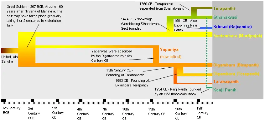 O primeiro cisma no jainismo aconteceu por volta do século IV a.C., levando ao surgimento de duas seitas principais, Digambara e Svetambara, que mais tarde foram subdivididas em outras subseitas.[19]