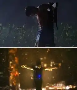 Isso foi estendido até o final da nona temporada, onde Clark sacrificou sua própria vida no final, no intuito de enviar o General Zod e o resto dos Kandorianos para o próprio mundo deles. Ao fazer isso, Clark caiu de um prédio "... em completa pose da crucificação, deixando claro que ele está se sacrificando pelo bem do planeta".[72] Até este ponto, Tom Powers da Cinefantastique sugeriu que essas imagens e ênfases metafóricas por meio de trocas de diálogo foram tão "mão peada" que um indivíduo muito devoto poderia considerá-las ofensivas.[73]