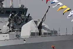 O armamento inclui oito células em uma UVP 3S14, uma montagem de artilharia automática universal de 100 mm A-190, 3K90M naquela UVP 3S90M (contendo 24 9M317M), duas montagens de seis canos de tiro rápido de 30 mm AK-630 M.[32] A proteção anti-submarino e anti-torpedo é fornecida por dois tubos de torpedo de tubo duplo de 533 mm e RBU 600.
