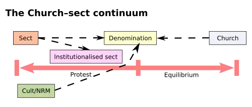 Outros estudiosos melhoraram a tipologia com subtipos. Howard Becker criou um continuum de tipos que vão do culto à seita, à denominação e à eclésia, e John Milton Yinger delineou uma tipologia sêxtupla: a igreja universal (por exemplo, a Igreja Católica Romana ), a eclésia, com a qual ele quis dizer estabelecida igrejas nacionais (por exemplo, a Igreja da Inglaterra, a Igreja Ortodoxa Russa ), a denominação (por exemplo, Batistas, Presbiterianos ), a seita estabelecida (por exemplo, Adventistas do Sétimo Dia, Quakers ), a seita (por exemplo, muitos pentecostais, a Igreja Mundial Igreja de Deus ) e o culto (por exemplo, Meninos de Deus, Cientologia ).[5][12][8] Benton Johnson simplificou a definição de seita e igreja e baseou-a numa única variável: o grau de aceitação do ambiente social. Uma igreja é um grupo religioso que aceita o ambiente social em que existe e uma seita é um grupo religioso que o rejeita.[7][3]