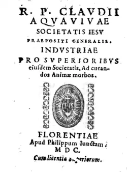 - ↑ a b Claudio Acquaviva Industriae ad curandos animae morbos Florence, 1600: Googlebooks [[iarchive:bub_gb_KAE8AAAAcAAJ|]]