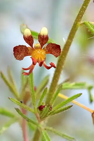 É uma planta herbácea, terófila, que possui as folhas palmadas (folíolos dispostos como os dedos de uma mano) e o pistilo encontra-se num grande entre-nó, que se encontra logo acima dos estames. A floração dá-se de Abril a Agosto.[3]
