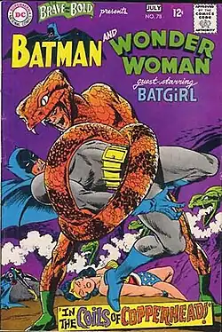 ![]() Primeira aparição do Cobra Venenosa em The Brave and the Bold #78 (Julho de 1968). Arte por Bob Brown. | |