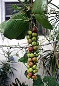 As plantas adultas produzem no final do Verão grandes cachos de pequenas frutos globosos roxos, em grupos de 40 a 50 por cacho, que na sua estrutura são aparentemente semelhantes a uvas, o que mereceu à espécie o nome comum de uva-da-praia. Os frutos são pequenas bagas, com cerca de 2 cm de diâmetro, carnudos e suculento, com sabor adocicado e fragrância forte. Cada fruto é composto por uma polpa comestível que rodeia uma grande semente globular com uma ponta aguçada na parte distal. A polpa é usado em compotas e na confecção de bebidas e sobremesas nos países das Caraíbas.