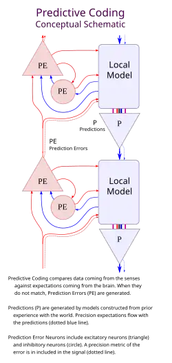 Grande parte do trabalho inicial que aplicou uma estrutura de codificação preditiva aos mecanismos neurais veio do processamento sensorial, particularmente no córtex visual.[3][13] Essas teorias pressupõem que a arquitetura cortical pode ser dividida em níveis hierarquicamente empilhados, que correspondem a diferentes regiões corticais. Acredita-se que cada nível abriga (pelo menos) dois tipos de neurônios: "neurônios de previsão", que visam prever as entradas de baixo para cima no nível atual, e "neurônios de erro", que sinalizam a diferença entre entrada e previsão. Acredita-se que esses neurônios sejam principalmente neurônios piramidais superficiais e não superficiais, enquanto os interneurônios desempenham funções diferentes.[13]