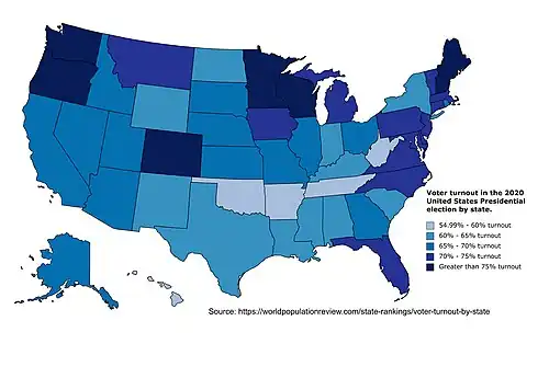 - ↑ «Voter Turnout By State 2021». worldpopulationreview.com. Consultado em 27 de julho de 2021