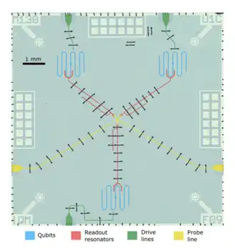 - ↑ Kelly, J.; Barends, R.; Fowler, A. G.; Megrant, A.; Jeffrey, E.; White, T. C.; Sank, D.; Mutus, J. Y.; Campbell, B.; Chen, Yu; Chen, Z.; Chiaro, B.; Dunsworth, A.; Hoi, I.-C.; Neill, C.; O’Malley, P. J. J.; Quintana, C.; Roushan, P.; Vainsencher, A.; Wenner, J.; Cleland, A. N.; Martinis, John M. (4 Março 2015). «State preservation by repetitive error detection in a superconducting quantum circuit». Nature. 519 (7541): 66–69. Bibcode:2015Natur.519...66K. PMID 25739628. arXiv:1411.7403