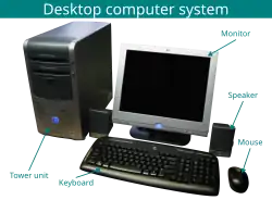 Um computador de escritório ou computador desktop (geralmente abreviado como desktop)[1] é um computador pessoal projetado para uso regular em um local estacionário ou próximo a uma mesa (em oposição a um computador portátil) devido ao seu tamanho e requisitos de energia. A configuração mais comum possui um gabinete que abriga a fonte de alimentação, placa-mãe (uma placa de circuito impresso com um microprocessador como unidade central de processamento, memória, barramento, certos periféricos e outros componentes eletrônicos), armazenamento em disco (geralmente uma ou mais unidades de disco rígido, unidades de estado sólido, unidades de disco óptico e, nos primeiros modelos , unidades de disquete ); um teclado e mouse para entrada; e um monitor, alto-falantes e, muitas vezes, uma impressora para saída. A caixa pode ser orientada horizontalmente ou verticalmente e colocada embaixo, ao lado ou em cima de uma mesa. Os computadores desktop com seus gabinetes orientados verticalmente são chamados de torres. Como a maioria dos gabinetes oferecidos desde meados da década de 1990 estão neste formato, o termo desktop tem sido usado retronimicamente para se referir a gabinetes modernos oferecidos na orientação horizontal tradicional.[2][3]