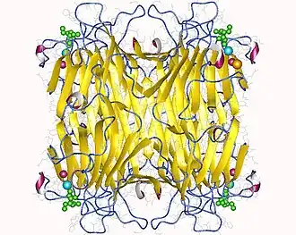 - ↑ PDB 3CNA; Hardman, Karl D.; Ainsworth, Clinton F. (1972). «Structure of concanavalin a at 2.4-Ang resolution». Biochemistry. 11 (26): 4910–9. PMID 4638345. doi:10.1021/bi00776a006