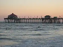 Do topo, da esquerda para a direita: Visão área da costa de Newport Beach, Castelo da Bela Adormecida na Disneyland, Huntington Beach Pier, Pier em San Clemente, Laguna Beach |