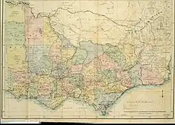 Os condados de Victoria foram publicados em etapas entre 1849 e 1871. Existem 37 condados, com aproximadamente 40 x 40 milhas de tamanho, que são ainda divididos em 2914[36] paróquias. As paróquias foram subdivididas em seções de vários tamanhos para venda como alocações agrícolas ou designadas como uma cidade e depois divididas em seções e estas subdivididas em alocações da coroa. No entanto, muitas paróquias em Victoria não seguem as fronteiras do condado, algumas sendo localizadas em mais de um município, ao contrário de Nova Gales do Sul. O condado com a maior população é o Condado de Bourke, que contém Melbourne. Documentos legais podem descrever o Condado, Paróquia, Township (se houver um), Seção, número de alocação da Coroa e número do Plano Certificado.[37] Por exemplo: "Condado de Dalhousie, Paróquia de Lauriston, Sendo 2 hectares, sendo alocação da Coroa 2, seção 40"[38] ou "Paróquia de Ballarat, Condado de Grant.. Alocação da Coroa 29, Seção 101, Township de Ballarat East.. Como mostrado no Plano Certificado No. 105127" [39]