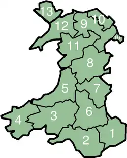 Os treze condados históricos do País de Gales foram fixados por estatuto em 1535 (embora alguns condados, como Pembrokeshire datem de 1138). Os "condados administrativos" do País de Gales criados em 1889 se baseavam nos treze originais. Em 1974, criou-se um novo sistema usando uma grande variedade de novas entidades. Estas foram abolidas em 1996 e, desde então, o País de Gales foi dividido em autoridades unitárias chamadas de "áreas principais".