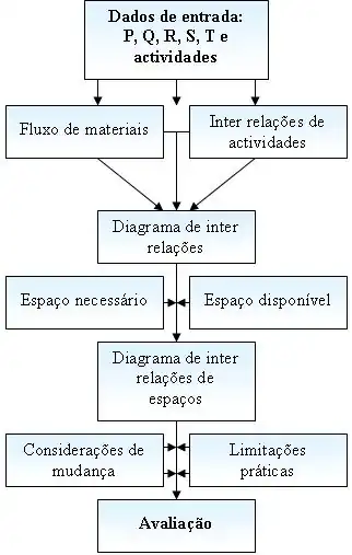 O Systematic Layout Planning (SLP) foi desenvolvido para facilitar o planejamento do layout. Este método trabalha com as seguintes variáveis: Produto (materiais), Quantidade (volumes), Roteiro (sequência do processo de fabricação), Serviços de suporte e Tempo (P, Q, R, S, T) (Muther, 1978, p. 2). Estas variáveis e a identificação das atividades a incluir num layout são os dados básicos para o seu desenvolvimento, como é possível verificar através da Figura 1.
